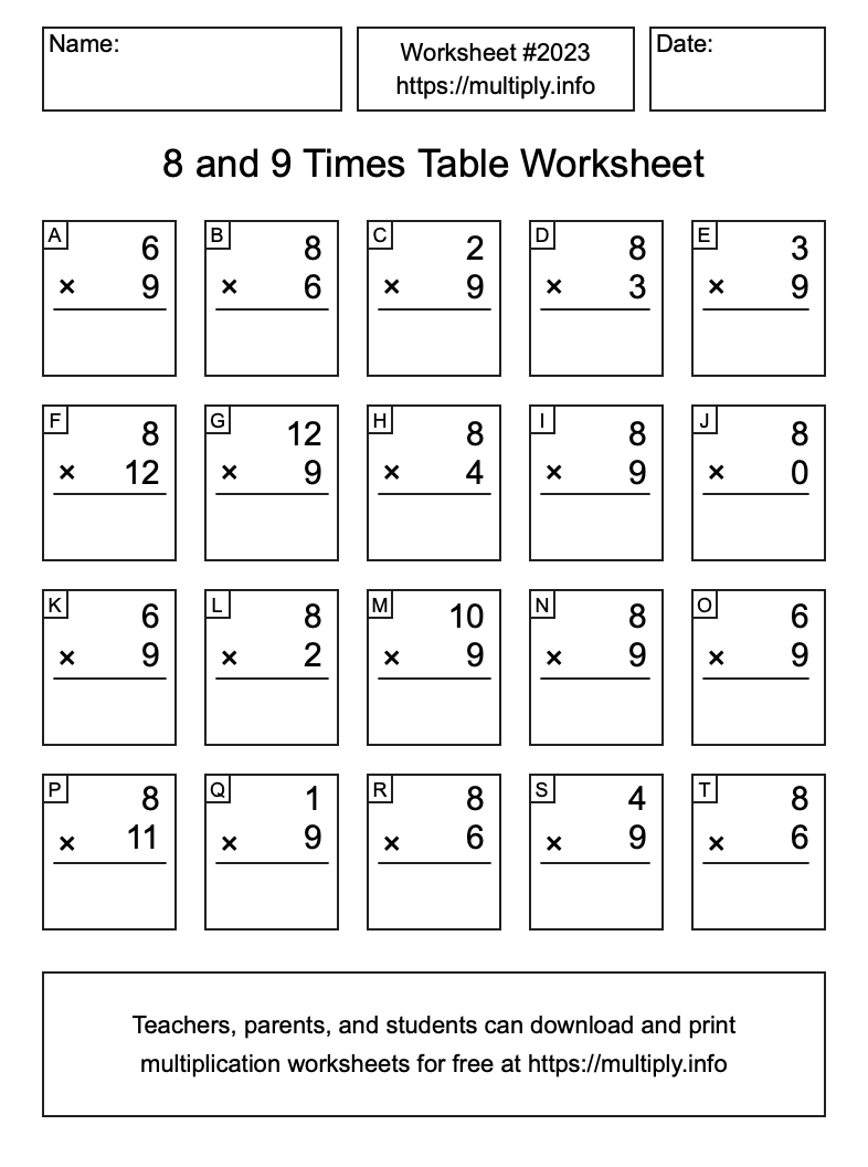 8 and 9 Times Table Worksheet #2024