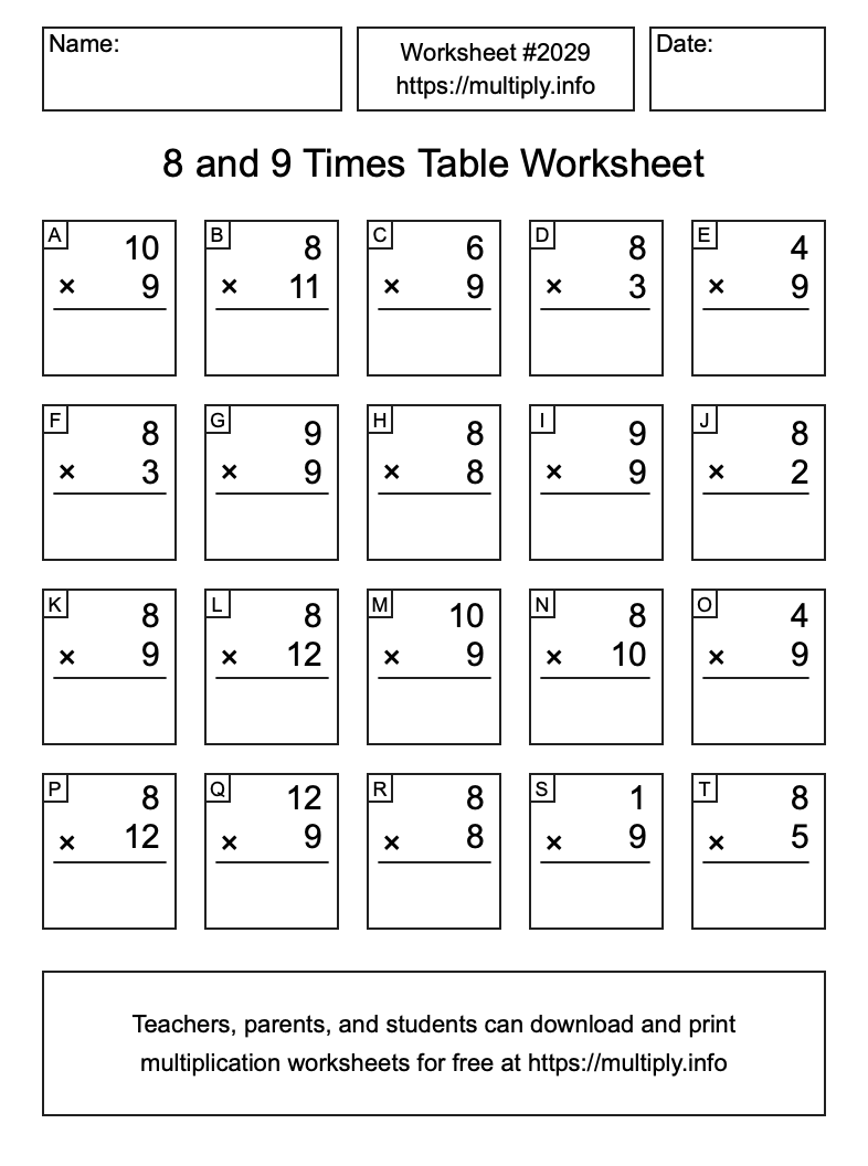 8 and 9 Times Table Worksheet #2030