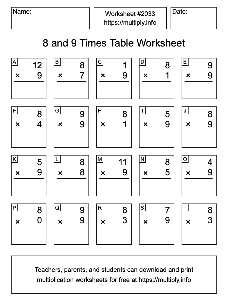 8 and 9 Times Table Worksheet #2034