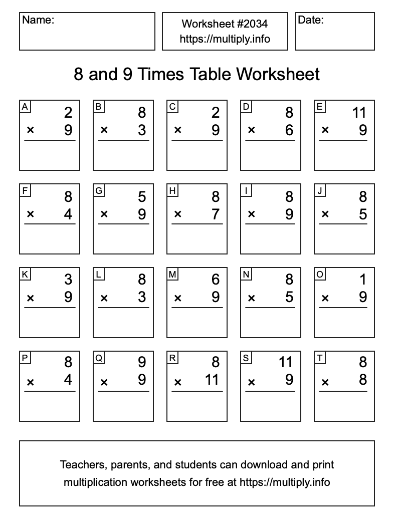 Here is the 8 and 9 Times Table Worksheet #2034. This worksheet contains problems related to the multiplication table of 8 and the multiplication table of 9. Print and/or save the worksheet using the buttons below the image. You can also drag or right-click on the image to download it to your device.