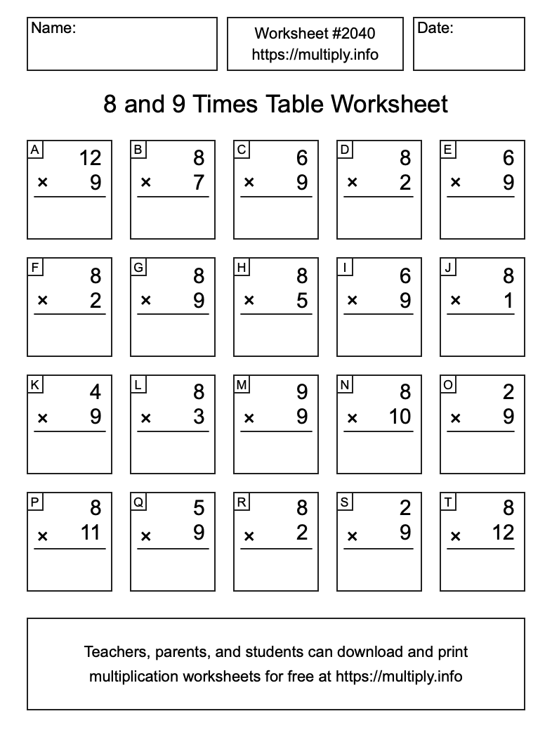 8 and 9 Times Table Worksheet #2041