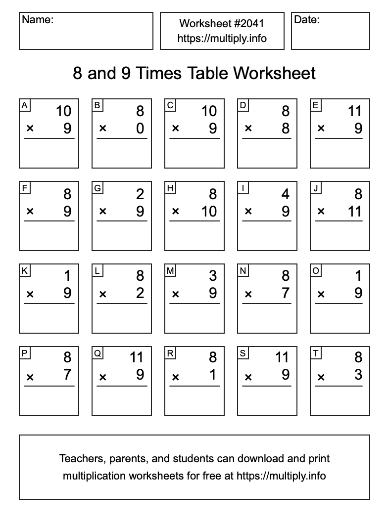 8 and 9 Times Table Worksheet #2042