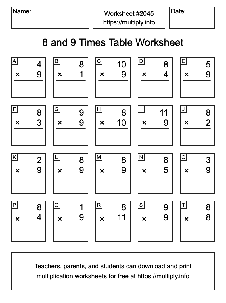 Here is the 8 and 9 Times Table Worksheet #2045. This worksheet contains problems related to the multiplication table of 8 and the multiplication table of 9. Print and/or save the worksheet using the buttons below the image. You can also drag or right-click on the image to download it to your device.