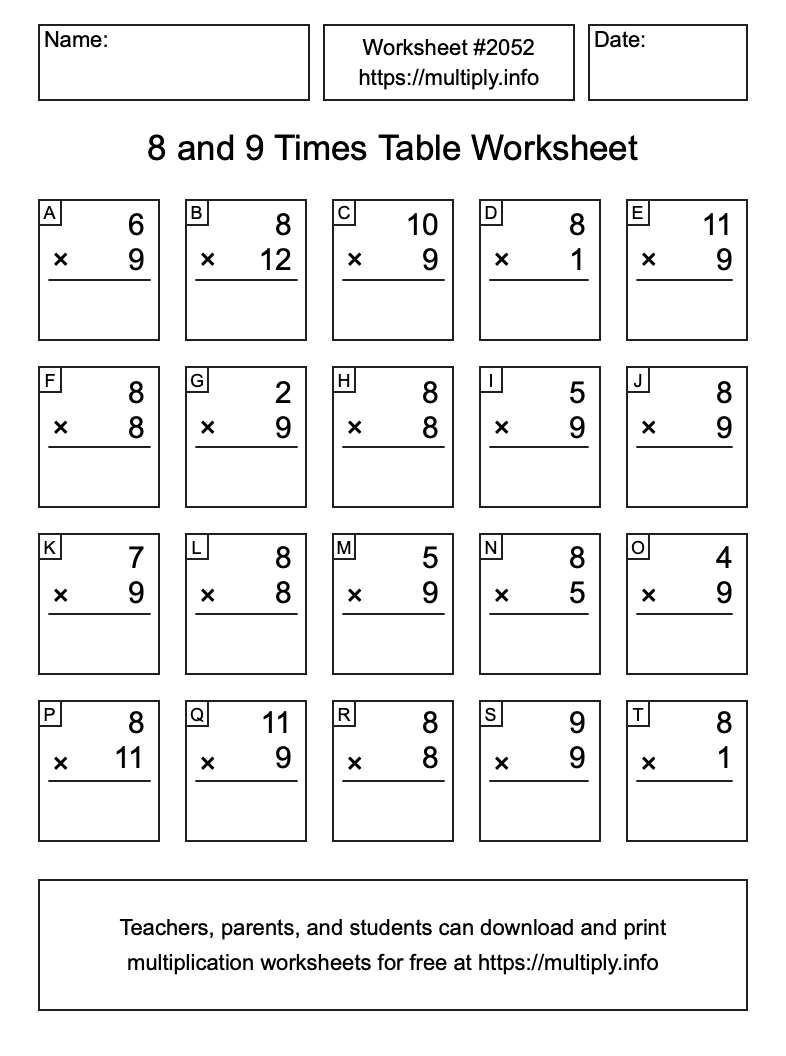 Here is the 8 and 9 Times Table Worksheet #2052. This worksheet contains problems related to the multiplication table of 8 and the multiplication table of 9. Print and/or save the worksheet using the buttons below the image. You can also drag or right-click on the image to download it to your device.