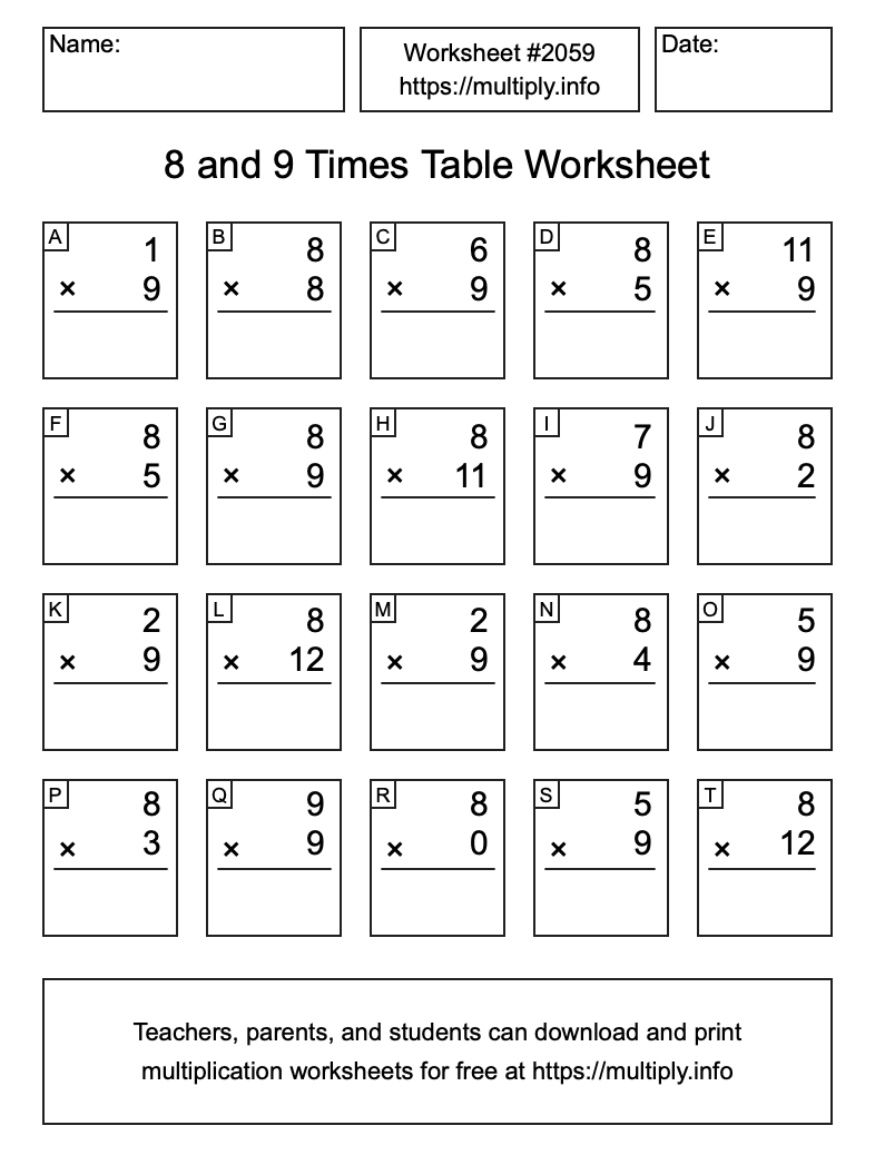 Here is the 8 and 9 Times Table Worksheet #2059. This worksheet contains problems related to the multiplication table of 8 and the multiplication table of 9. Print and/or save the worksheet using the buttons below the image. You can also drag or right-click on the image to download it to your device.