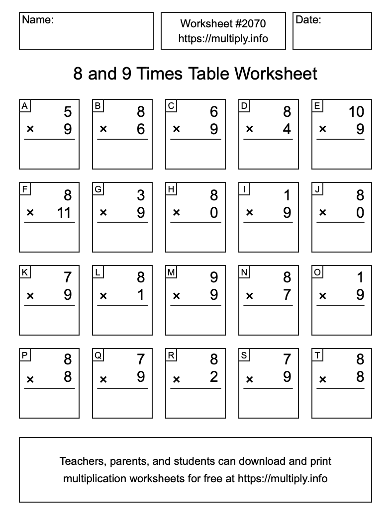8 and 9 Times Table Worksheet #2071