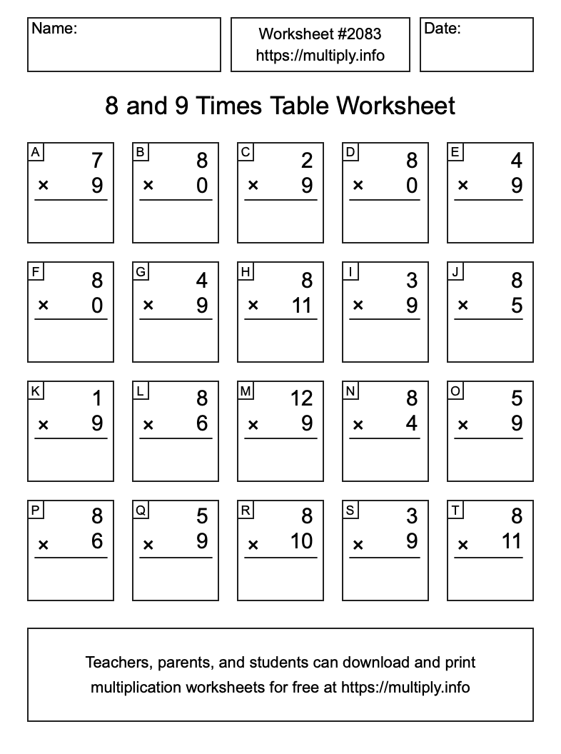 Here is the 8 and 9 Times Table Worksheet #2083. This worksheet contains problems related to the multiplication table of 8 and the multiplication table of 9. Print and/or save the worksheet using the buttons below the image. You can also drag or right-click on the image to download it to your device.