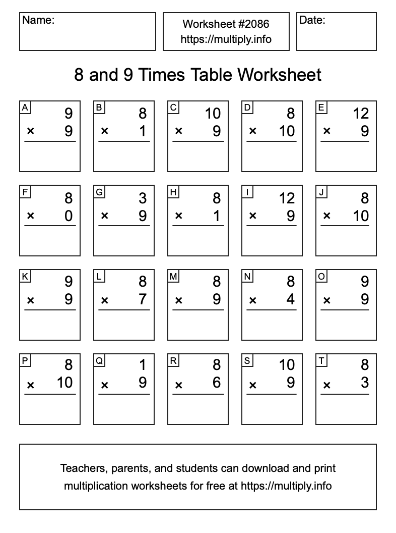 8 and 9 Times Table Worksheet #2087