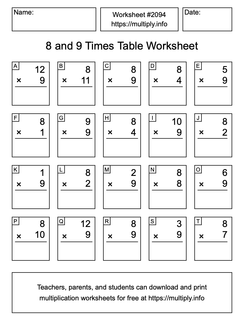 Here is the 8 and 9 Times Table Worksheet #2094. This worksheet contains problems related to the multiplication table of 8 and the multiplication table of 9. Print and/or save the worksheet using the buttons below the image. You can also drag or right-click on the image to download it to your device.