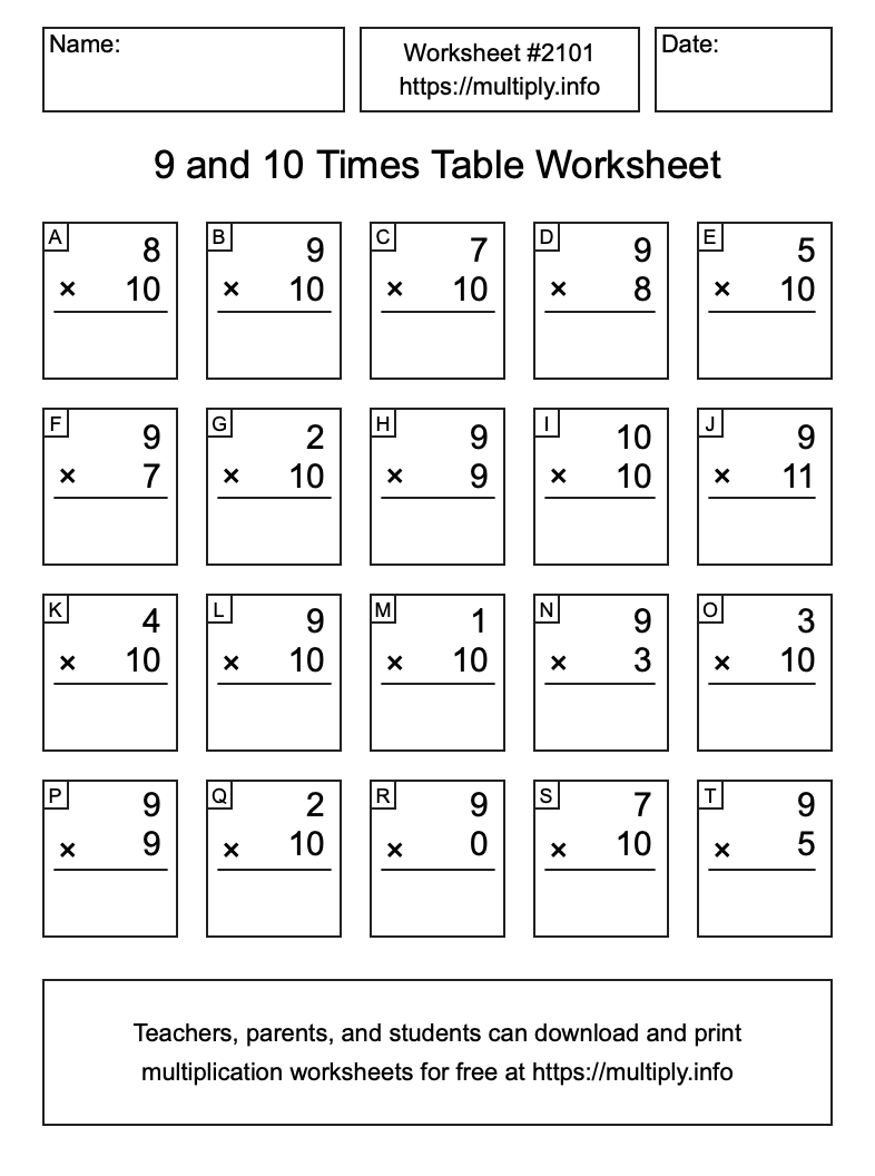 Here is the 9 and 10 Times Table Worksheet #2101. This worksheet contains problems related to the multiplication table of 9 and the multiplication table of 10. Print and/or save the worksheet using the buttons below the image. You can also drag or right-click on the image to download it to your device.