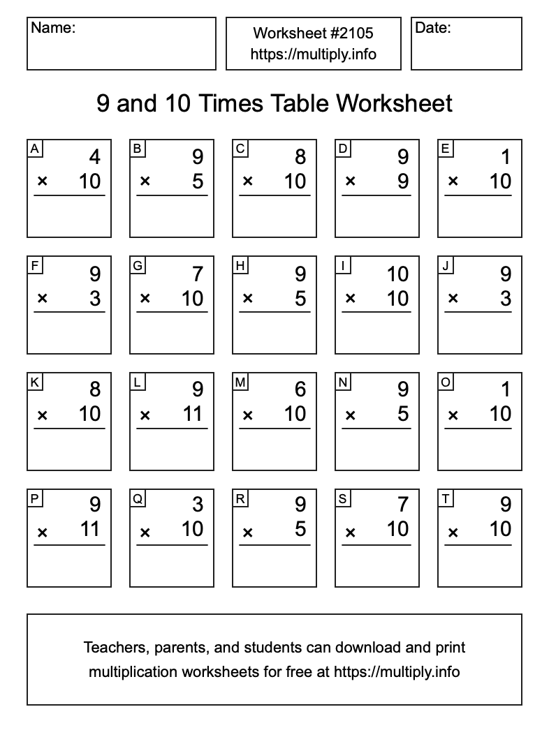 Here is the 9 and 10 Times Table Worksheet #2105. This worksheet contains problems related to the multiplication table of 9 and the multiplication table of 10. Print and/or save the worksheet using the buttons below the image. You can also drag or right-click on the image to download it to your device.