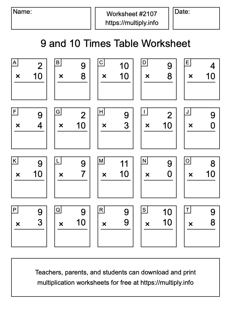 Here is the 9 and 10 Times Table Worksheet #2107. This worksheet contains problems related to the multiplication table of 9 and the multiplication table of 10. Print and/or save the worksheet using the buttons below the image. You can also drag or right-click on the image to download it to your device.