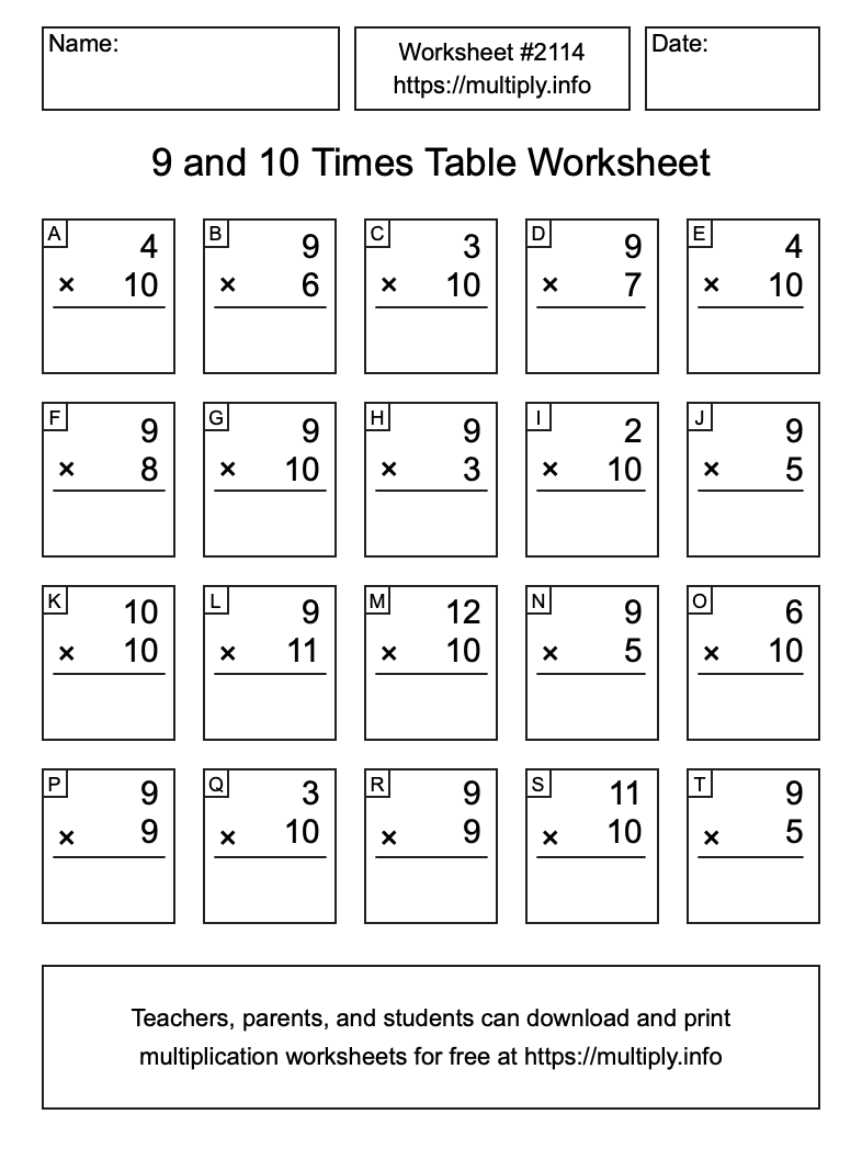 9 and 10 Times Table Worksheet #2115