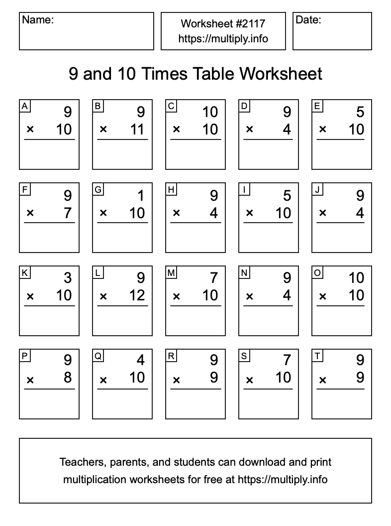 9 and 10 Times Table Worksheet #2118