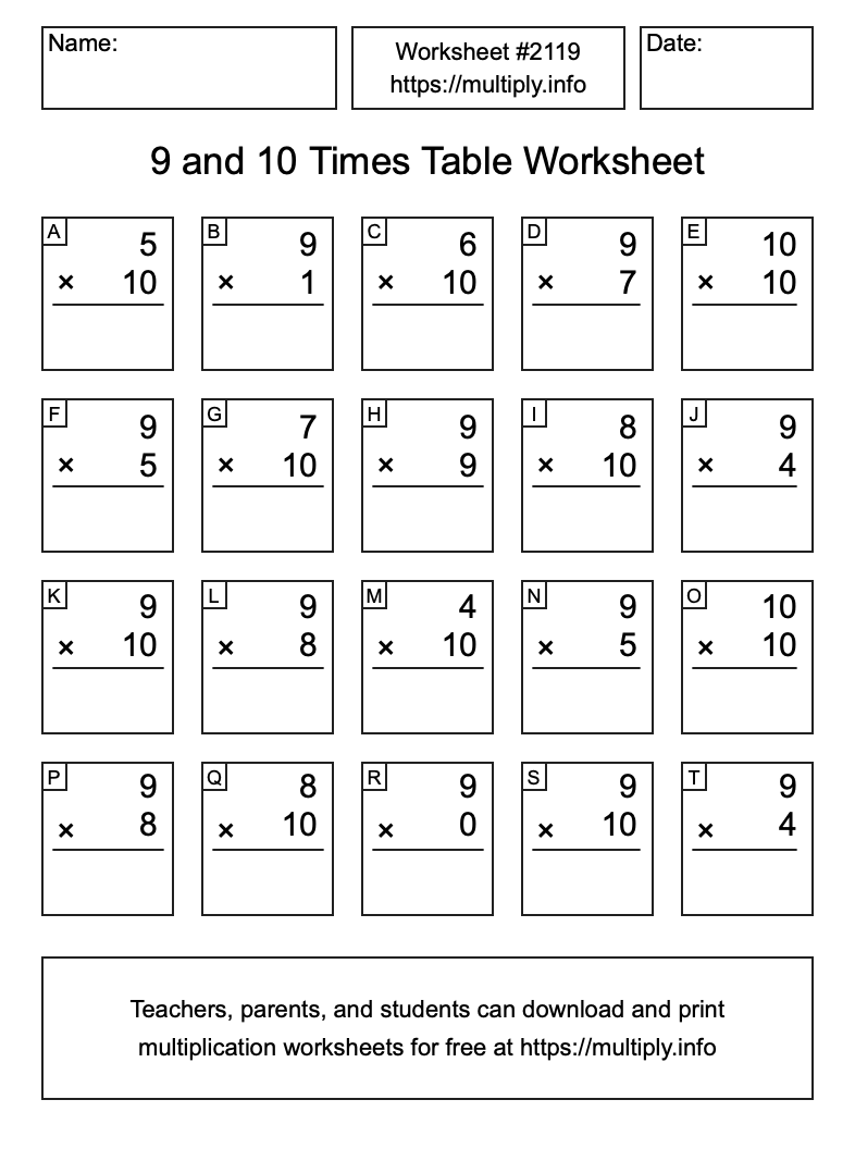 9 and 10 Times Table Worksheet #2120