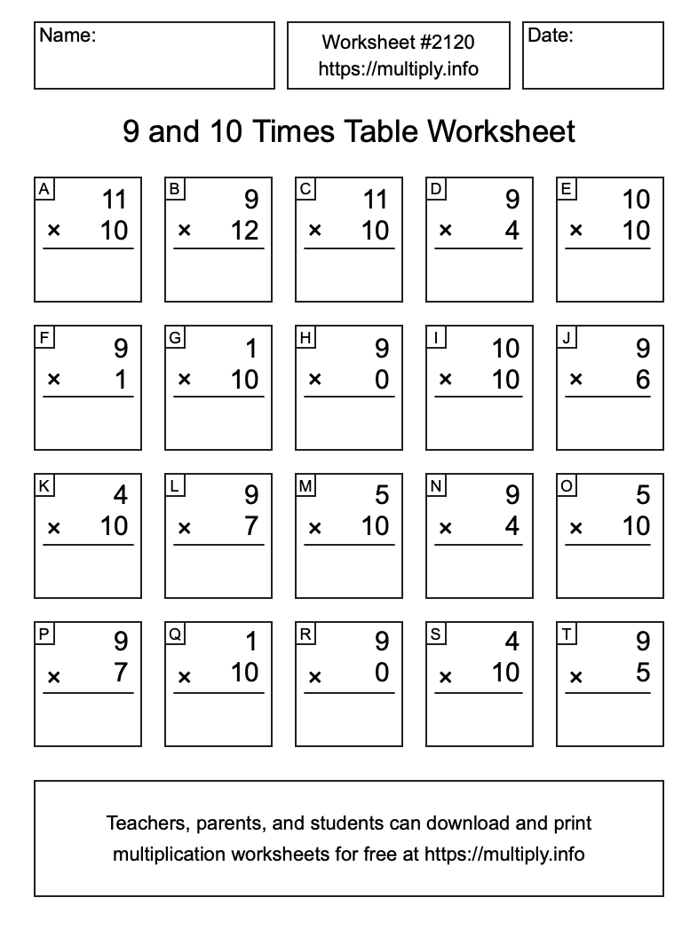 Here is the 9 and 10 Times Table Worksheet #2120. This worksheet contains problems related to the multiplication table of 9 and the multiplication table of 10. Print and/or save the worksheet using the buttons below the image. You can also drag or right-click on the image to download it to your device.