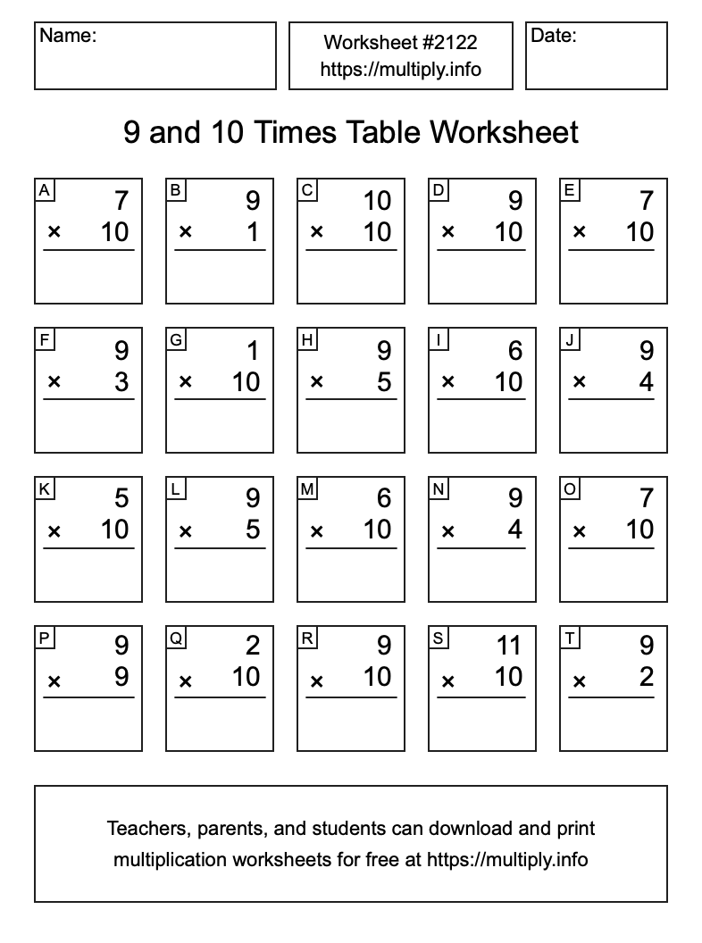 9 and 10 Times Table Worksheet #2123