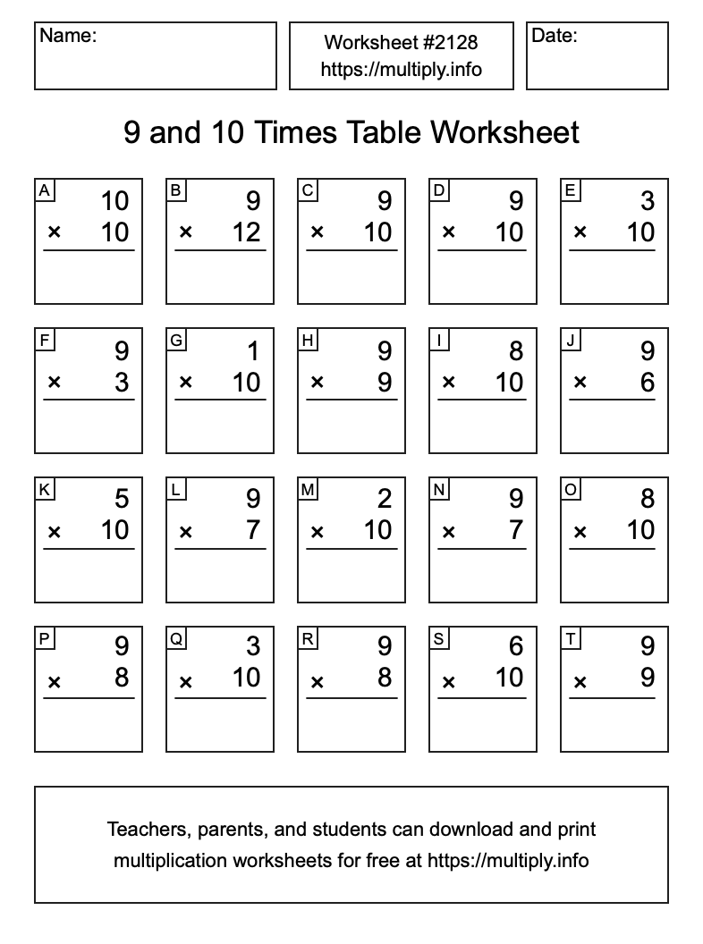 Here is the 9 and 10 Times Table Worksheet #2128. This worksheet contains problems related to the multiplication table of 9 and the multiplication table of 10. Print and/or save the worksheet using the buttons below the image. You can also drag or right-click on the image to download it to your device.