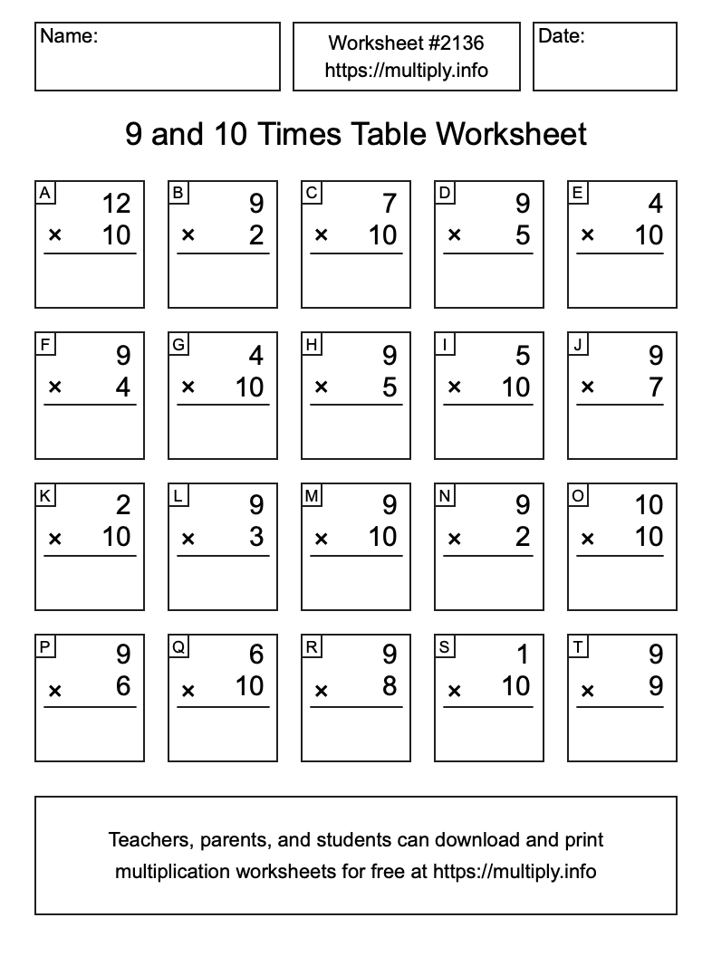 Here is the 9 and 10 Times Table Worksheet #2136. This worksheet contains problems related to the multiplication table of 9 and the multiplication table of 10. Print and/or save the worksheet using the buttons below the image. You can also drag or right-click on the image to download it to your device.
