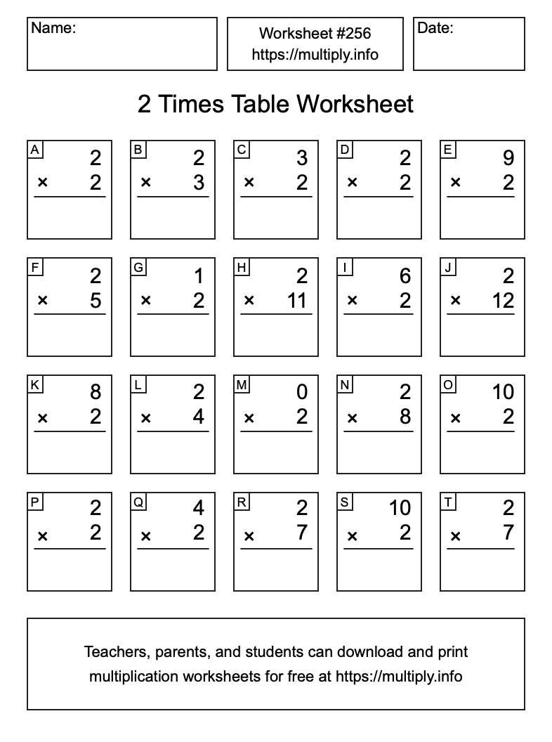 Here is the 2 Times Table Worksheet #256. This worksheet contains problems related to the multiplication table of 2. Print and/or save the worksheet using the buttons below the image. You can also drag or right-click on the image to download it to your device.