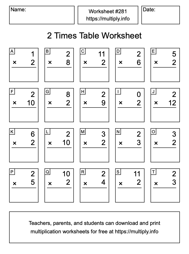 Here is the 2 Times Table Worksheet #281. This worksheet contains problems related to the multiplication table of 2. Print and/or save the worksheet using the buttons below the image. You can also drag or right-click on the image to download it to your device.