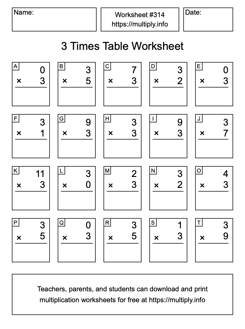 Here is the 3 Times Table Worksheet #314. This worksheet contains problems related to the multiplication table of 3. Print and/or save the worksheet using the buttons below the image. You can also drag or right-click on the image to download it to your device.