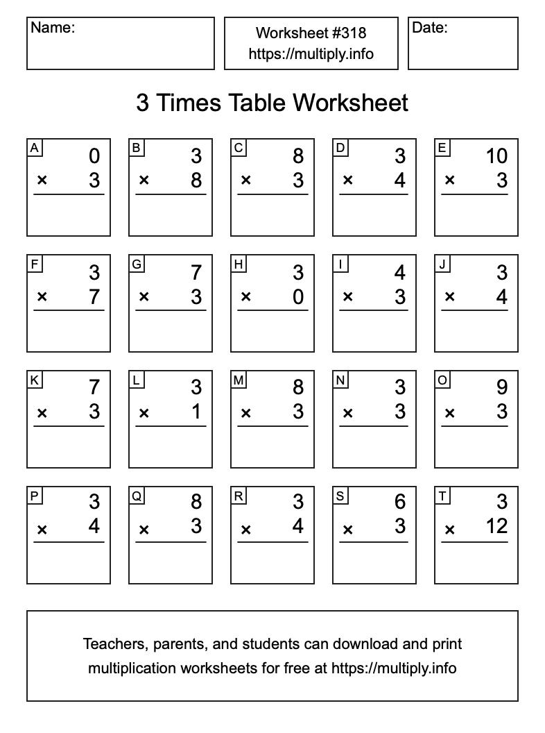 Here is the 3 Times Table Worksheet #318. This worksheet contains problems related to the multiplication table of 3. Print and/or save the worksheet using the buttons below the image. You can also drag or right-click on the image to download it to your device.