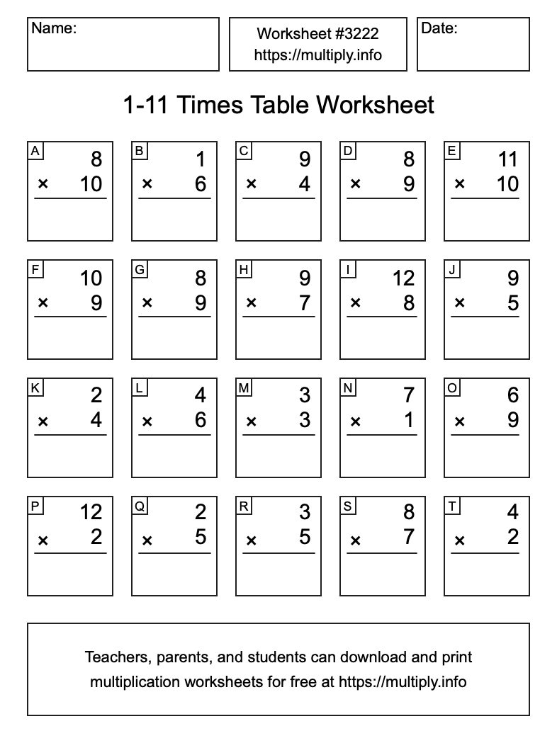 1 to 11 Times Table Worksheet #3223