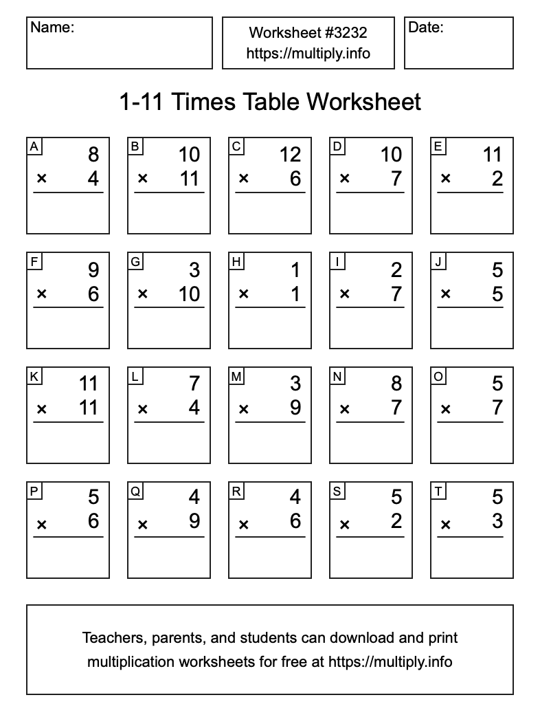 Here is the 1 to 11 Times Table Worksheet #3232. This worksheet contains problems related to the multiplication tables of 1 through 11. Print and/or save the worksheet using the buttons below the image. You can also drag or right-click on the image to download it to your device.