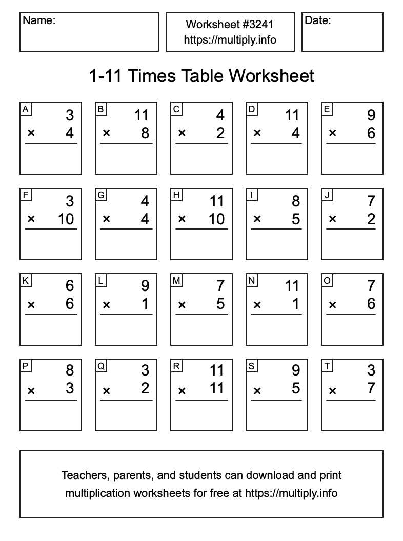 Here is the 1 to 11 Times Table Worksheet #3241. This worksheet contains problems related to the multiplication tables of 1 through 11. Print and/or save the worksheet using the buttons below the image. You can also drag or right-click on the image to download it to your device.