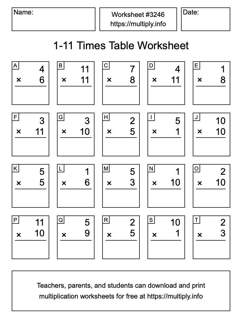 Here is the 1 to 11 Times Table Worksheet #3246. This worksheet contains problems related to the multiplication tables of 1 through 11. Print and/or save the worksheet using the buttons below the image. You can also drag or right-click on the image to download it to your device.