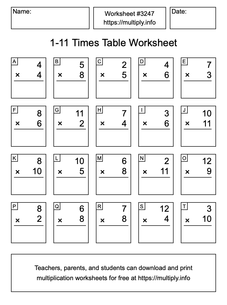 1 to 11 Times Table Worksheet #3248