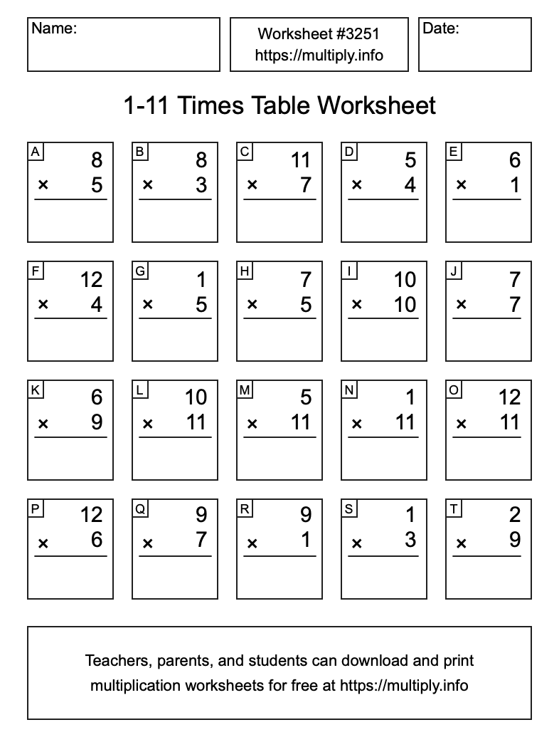 Here is the 1 to 11 Times Table Worksheet #3251. This worksheet contains problems related to the multiplication tables of 1 through 11. Print and/or save the worksheet using the buttons below the image. You can also drag or right-click on the image to download it to your device.
