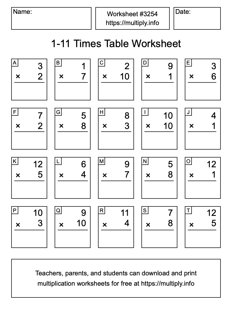 Here is the 1 to 11 Times Table Worksheet #3254. This worksheet contains problems related to the multiplication tables of 1 through 11. Print and/or save the worksheet using the buttons below the image. You can also drag or right-click on the image to download it to your device.