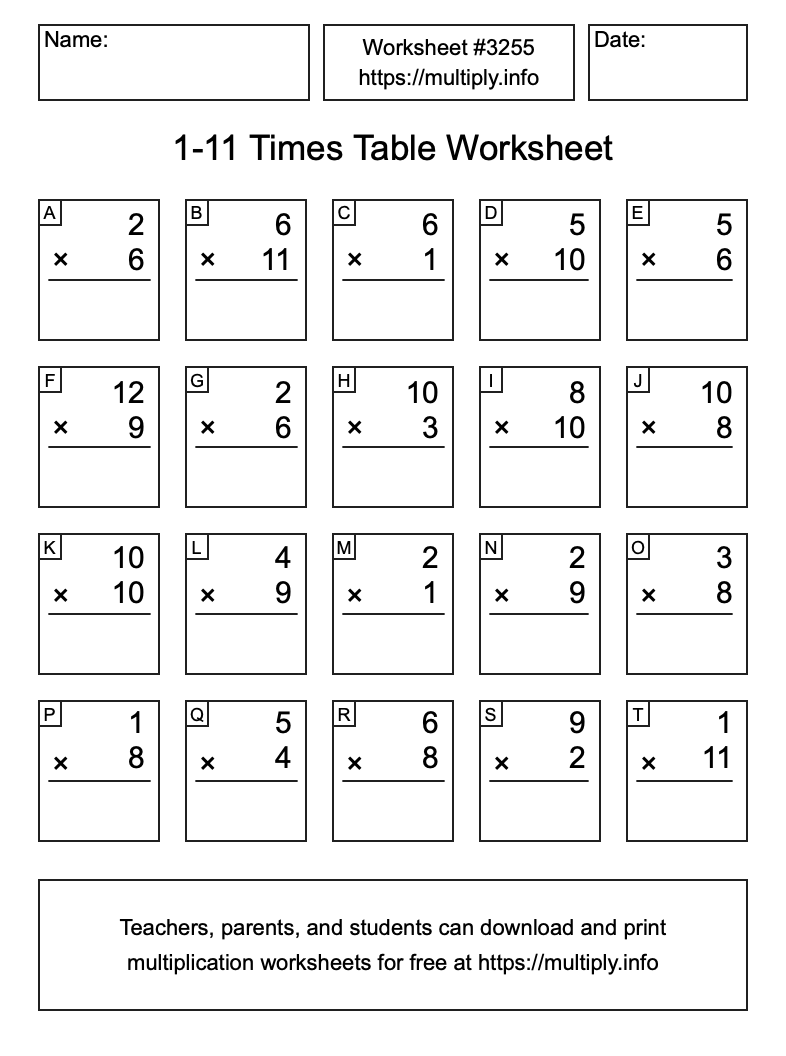 Here is the 1 to 11 Times Table Worksheet #3255. This worksheet contains problems related to the multiplication tables of 1 through 11. Print and/or save the worksheet using the buttons below the image. You can also drag or right-click on the image to download it to your device.