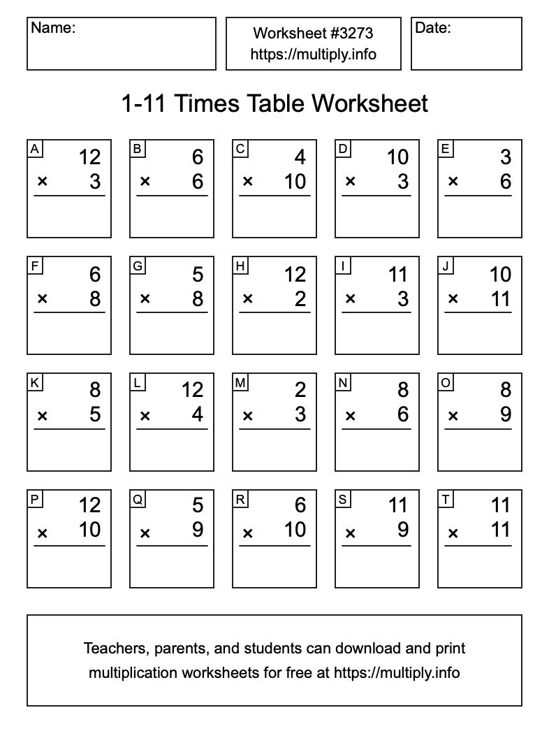 Here is the 1 to 11 Times Table Worksheet #3273. This worksheet contains problems related to the multiplication tables of 1 through 11. Print and/or save the worksheet using the buttons below the image. You can also drag or right-click on the image to download it to your device.