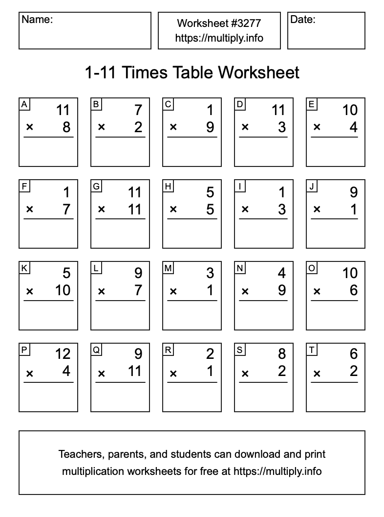 1 to 11 Times Table Worksheet #3278