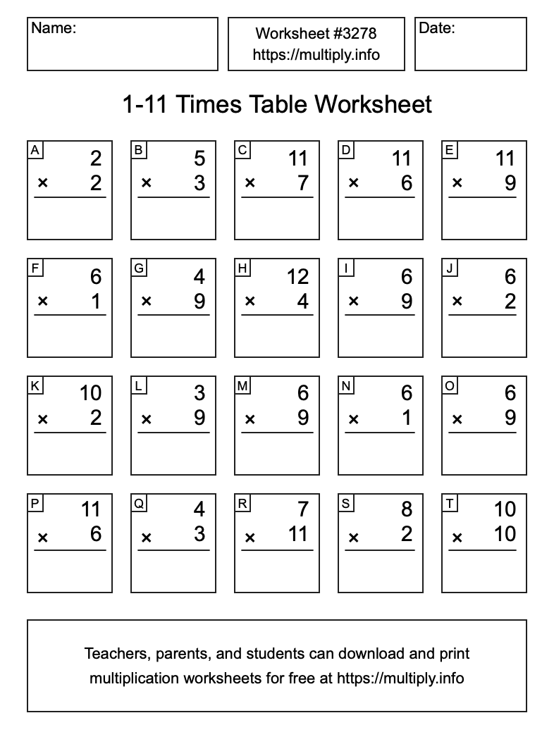 Here is the 1 to 11 Times Table Worksheet #3278. This worksheet contains problems related to the multiplication tables of 1 through 11. Print and/or save the worksheet using the buttons below the image. You can also drag or right-click on the image to download it to your device.