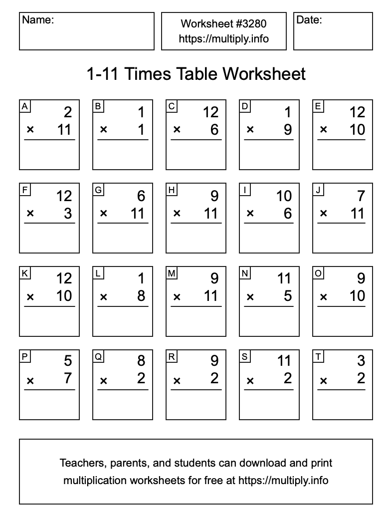 Here is the 1 to 11 Times Table Worksheet #3280. This worksheet contains problems related to the multiplication tables of 1 through 11. Print and/or save the worksheet using the buttons below the image. You can also drag or right-click on the image to download it to your device.