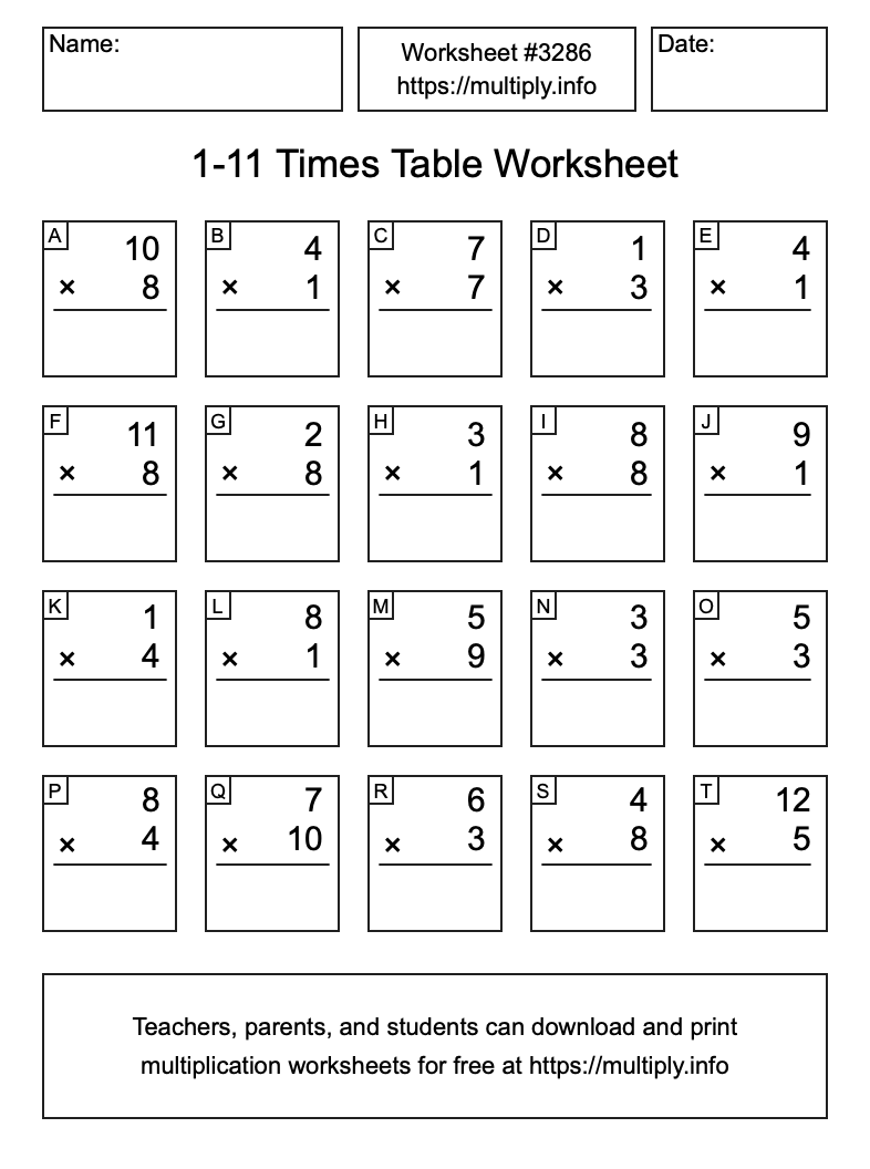 Here is the 1 to 11 Times Table Worksheet #3286. This worksheet contains problems related to the multiplication tables of 1 through 11. Print and/or save the worksheet using the buttons below the image. You can also drag or right-click on the image to download it to your device.