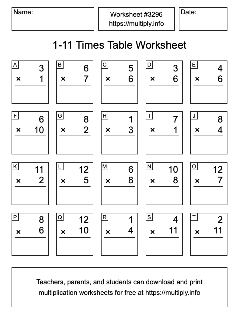 Here is the 1 to 11 Times Table Worksheet #3296. This worksheet contains problems related to the multiplication tables of 1 through 11. Print and/or save the worksheet using the buttons below the image. You can also drag or right-click on the image to download it to your device.