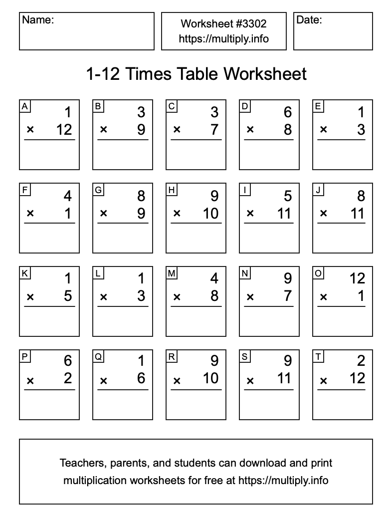 1 to 12 Times Table Worksheet #3303