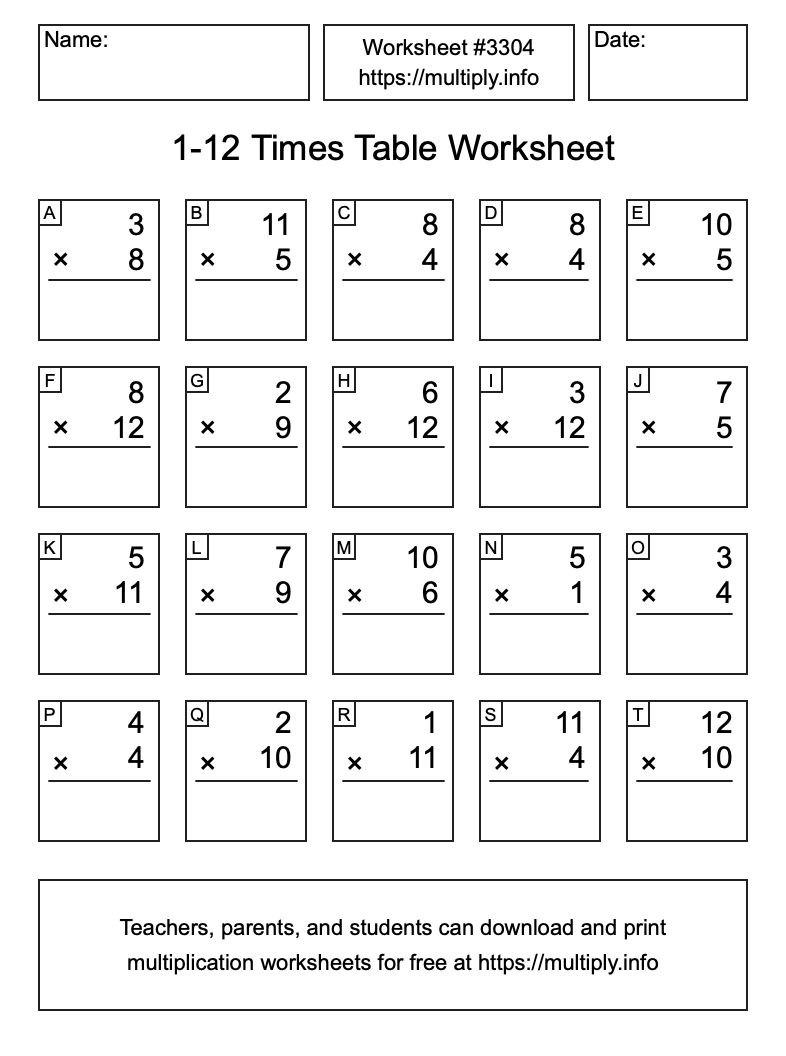 Here is the 1 to 12 Times Table Worksheet #3304. This worksheet contains problems related to the multiplication tables of 1 through 12. Print and/or save the worksheet using the buttons below the image. You can also drag or right-click on the image to download it to your device.