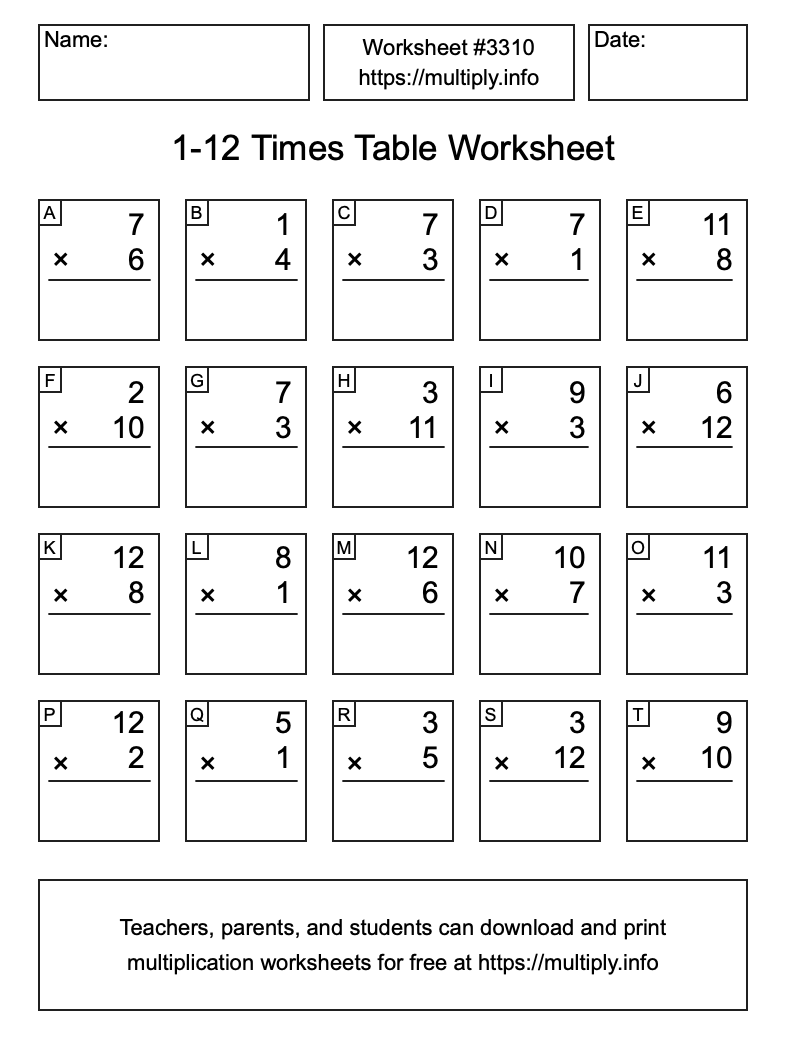 Here is the 1 to 12 Times Table Worksheet #3310. This worksheet contains problems related to the multiplication tables of 1 through 12. Print and/or save the worksheet using the buttons below the image. You can also drag or right-click on the image to download it to your device.