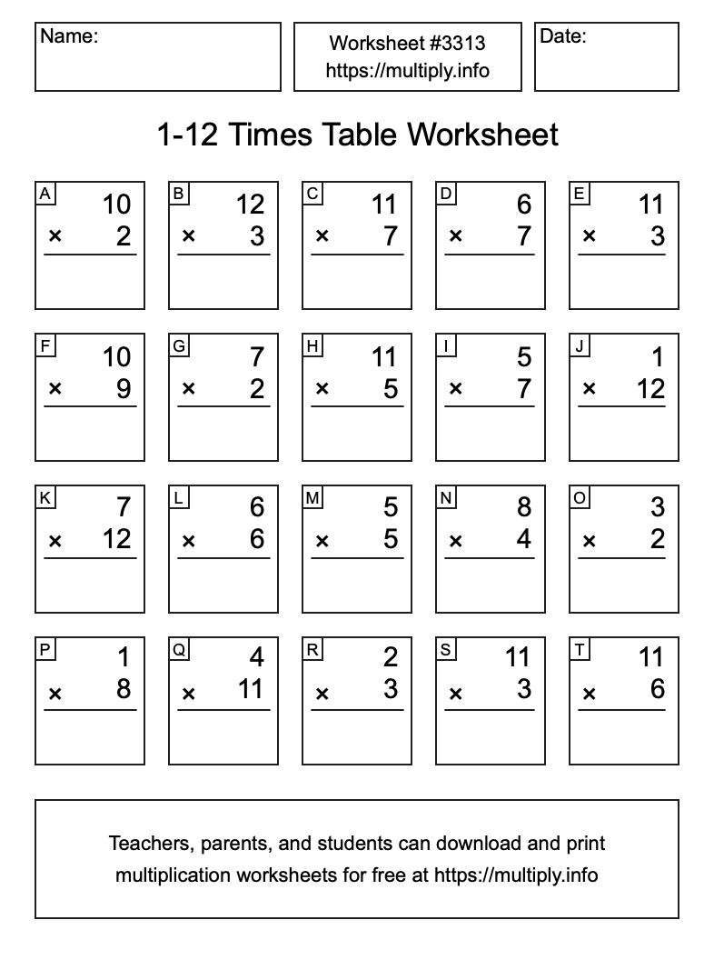 Here is the 1 to 12 Times Table Worksheet #3313. This worksheet contains problems related to the multiplication tables of 1 through 12. Print and/or save the worksheet using the buttons below the image. You can also drag or right-click on the image to download it to your device.