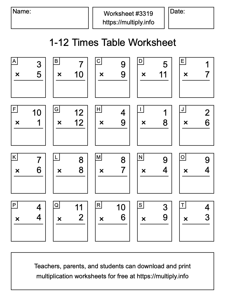 Here is the 1 to 12 Times Table Worksheet #3319. This worksheet contains problems related to the multiplication tables of 1 through 12. Print and/or save the worksheet using the buttons below the image. You can also drag or right-click on the image to download it to your device.