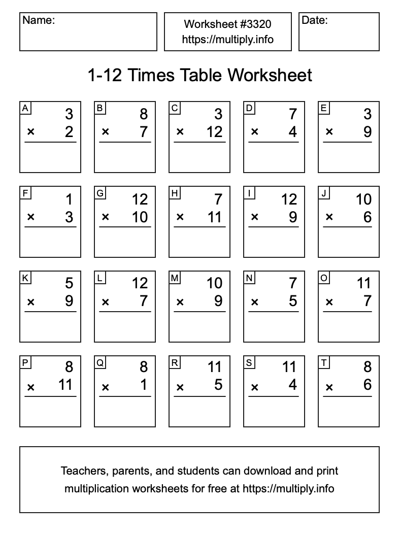 Here is the 1 to 12 Times Table Worksheet #3320. This worksheet contains problems related to the multiplication tables of 1 through 12. Print and/or save the worksheet using the buttons below the image. You can also drag or right-click on the image to download it to your device.