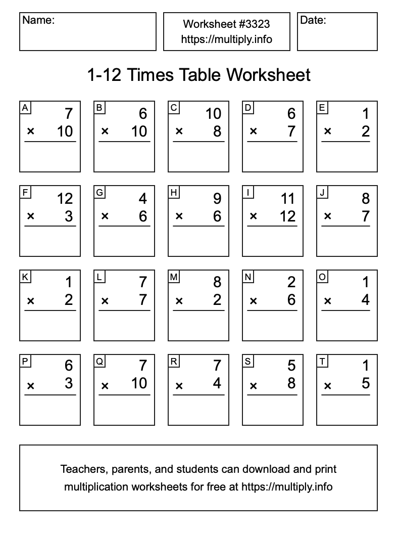 Here is the 1 to 12 Times Table Worksheet #3323. This worksheet contains problems related to the multiplication tables of 1 through 12. Print and/or save the worksheet using the buttons below the image. You can also drag or right-click on the image to download it to your device.