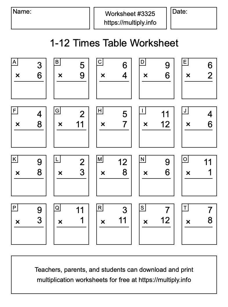 Here is the 1 to 12 Times Table Worksheet #3325. This worksheet contains problems related to the multiplication tables of 1 through 12. Print and/or save the worksheet using the buttons below the image. You can also drag or right-click on the image to download it to your device.