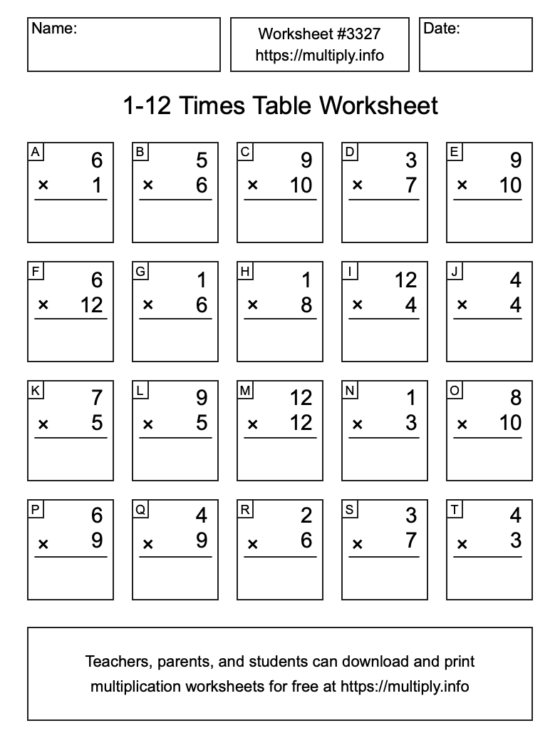 Here is the 1 to 12 Times Table Worksheet #3327. This worksheet contains problems related to the multiplication tables of 1 through 12. Print and/or save the worksheet using the buttons below the image. You can also drag or right-click on the image to download it to your device.